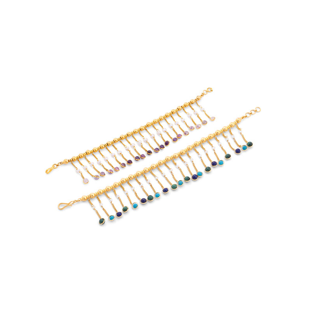 ذهب أصفر عيار 22 (13.903 جرام)، فيروز, ملكايت، لابيزابيز لازولي (1.575 جرام)، ولؤلؤ بحريني طبيعي (0.25 جرام) تقريبًا.