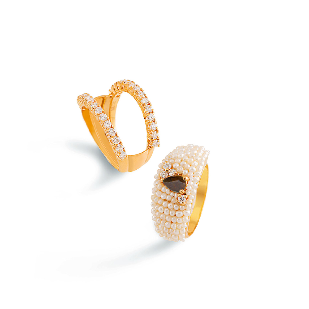 ذهب أصفر عيار 22 (11.612 جرام)، مرصع بالألماس درجة ڤي اس، اللون جي (0.977 قيراط)، كوارتز دخاني (0.083 جرام)، ولؤلؤ بحريني طبيعي (0.378 جرام) تقريبًا.