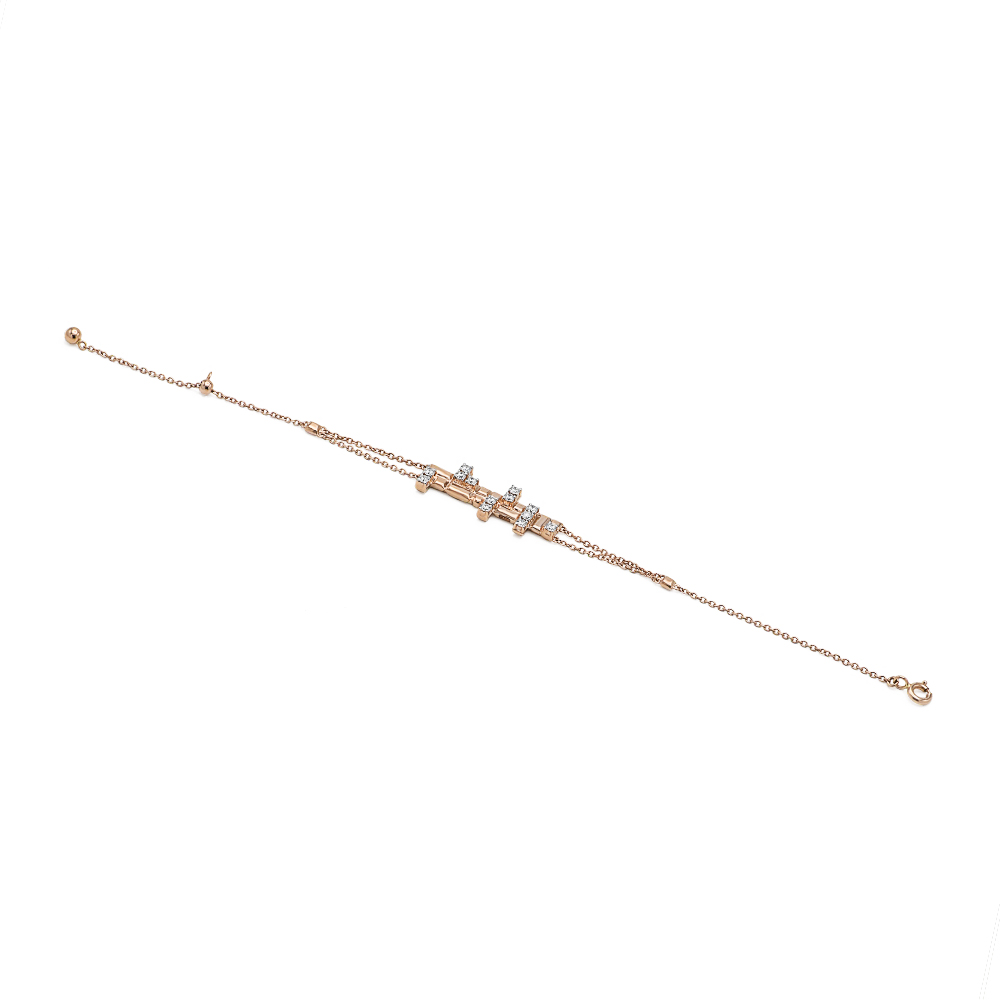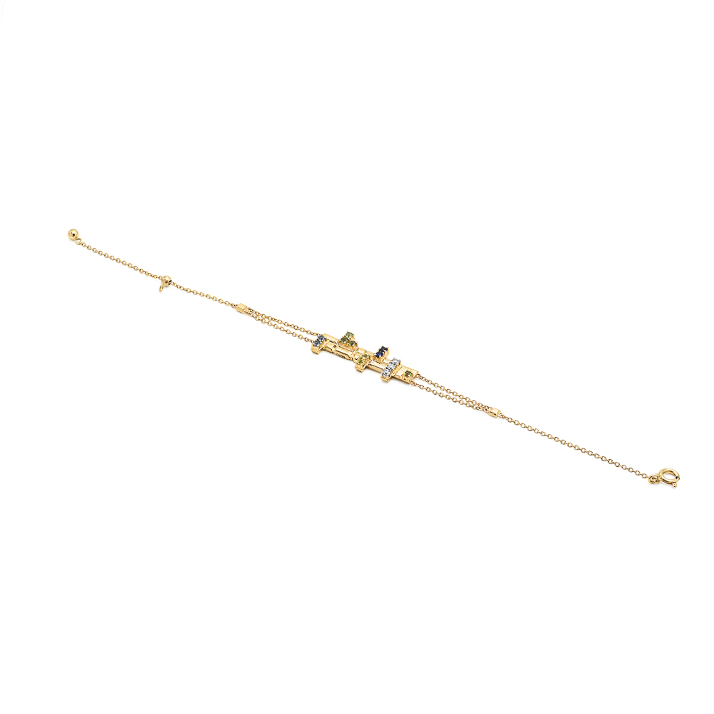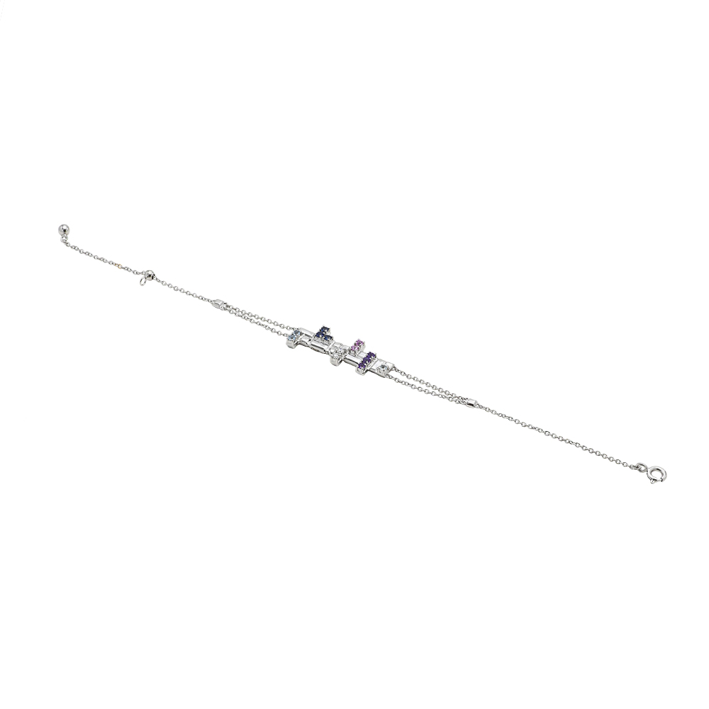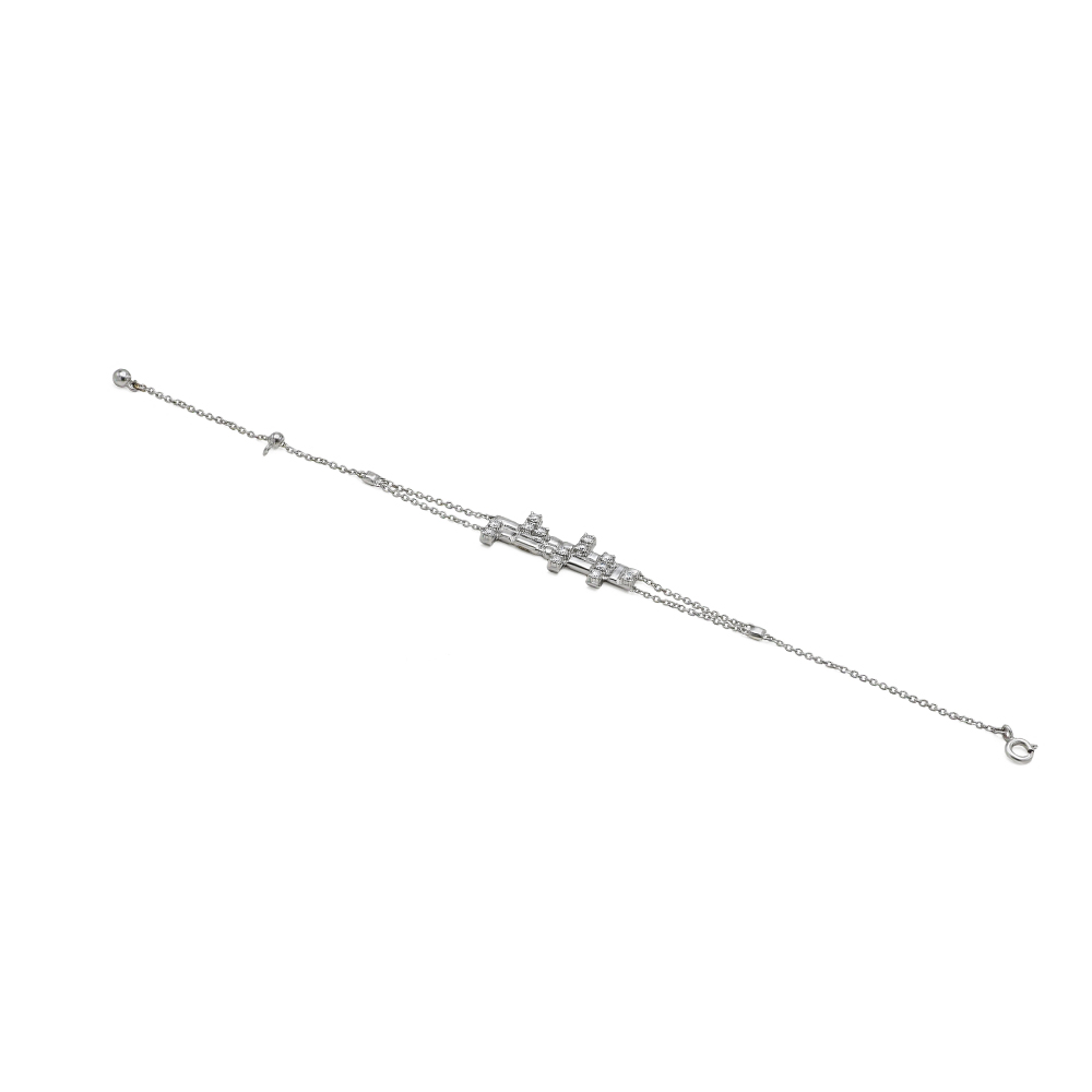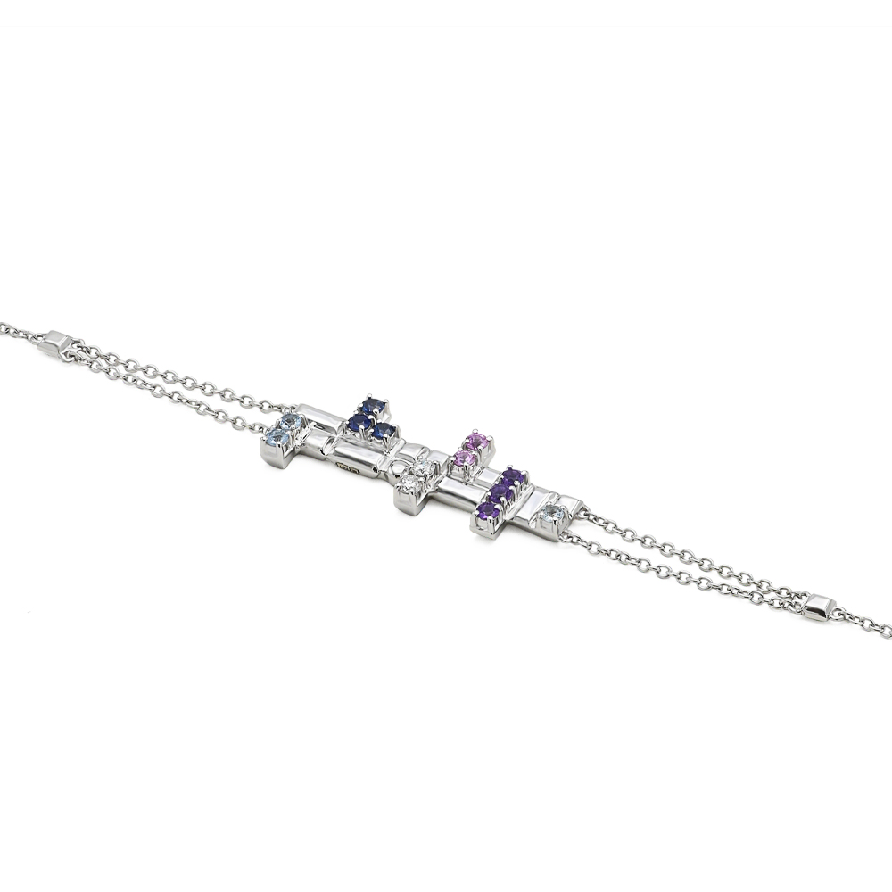 ذهب أبيض عيار 18 (4.437 جرام)، مرصع بالألماس درجة ڤي اس، اللون جي (0.06 قيراط)، والاحجار الكريمة (0.095 جرام) تقريبًا.
