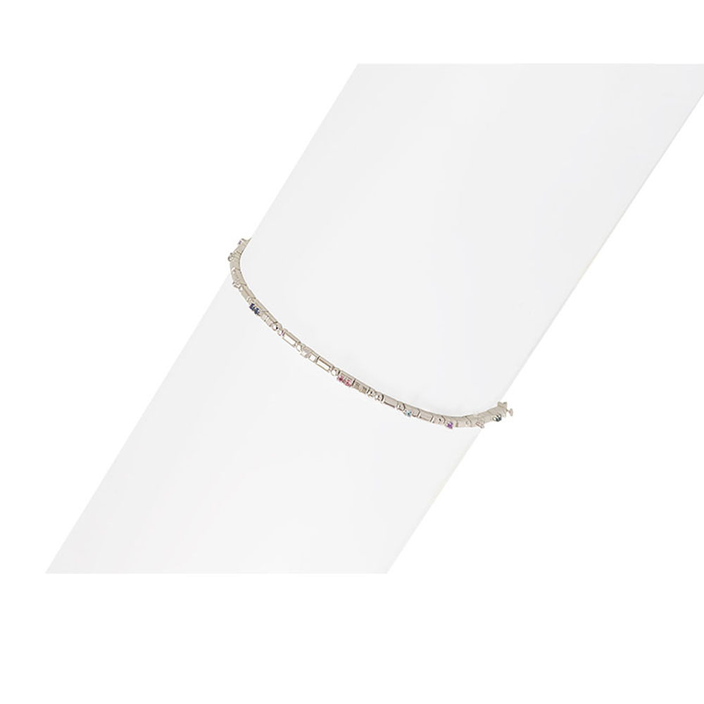 ذهب أبيض عيار 18 (9.75 جرام)، مرصع بالألماس درجة ڤي اس، اللون جي (0.09 قيراط)، والاحجار الكريمة (0.118 جرام) تقريبًا.